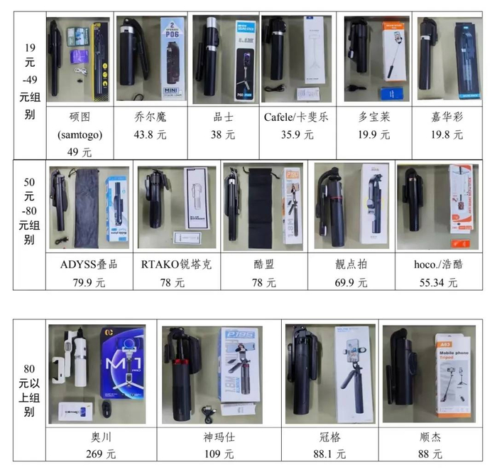 本次比较试验的自拍杆样品由广西消委会的工作人员以消费者的身份,从线上电商平台随机购买,包括奥川、神玛仕、硕图(samtogo)、RTAKO锐塔克、酷盟、靓点拍等品牌在内共计15款,单价从19.9元至269元不等。