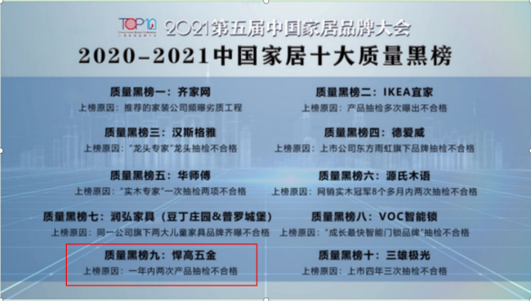 公开资料显示,2020年和2021年,悍高集团连续两年登上中国家居十大质量黑榜。