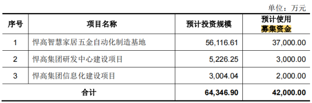 招股书显示,此次IPO,悍高集团计划募集资金4.2亿元,其中3.7亿元用于悍高智慧家居五金自动化制造基地,3000万元用于悍高集团研发中心建设项目,2000万元用于悍高集团信息化建设项目。