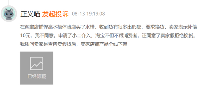另一消费者买到有瑕疵的悍高水槽,要求换货,被拒绝。