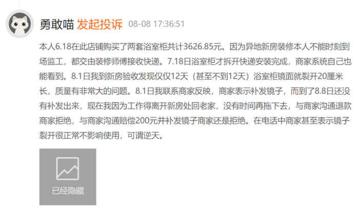 今年8月8日,一位消费者买了两套悍高的浴室柜,此后浴室柜的镜子出现裂痕,但商家拒绝退款,并 表示镜子裂开属于正常。