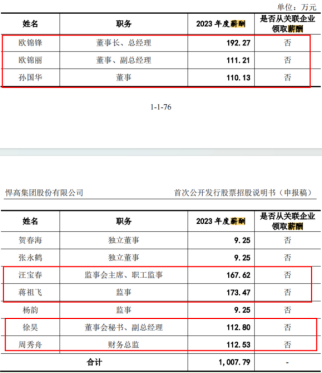 而且,悍高集团的高管们拿着不菲的薪酬,该公司有七位高管的年薪超过百万,其董事长、总经理欧锦锋的薪酬更是接近200万元,2023年薪酬为192.27万元;该公司的董事、副总经理欧锦丽的薪酬为111.21万元,兄妹二人薪酬合计超过300万元;2023年,该公司的董事孙国华的薪酬为110.13万元,其监事会主席、职工监事汪宝春的薪酬为167.62万元,其监事蒋祖飞的薪酬为173.47万元,其董事会秘书、副总经理徐昊的薪酬为112.8万元,其财务总监周秀舟的薪酬为112.53万元。由此可见,该公司的七位高管们的薪酬合计980.03万元,接近1000万元。