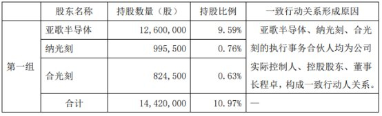 据芯碁微装公告,截至公告披露日,合肥亚歌半导体科技合伙企业(有限合伙)(以下简称“亚歌半导体”)、合肥纳光刻企业管理咨询合伙企业(有限合伙)(以下简称“纳光刻”)、合肥合光刻企业管理咨询合伙企业(有限合伙)(以下简称“合光刻”)分别持有芯碁微装12,600,000股、995,500股、824,500股,分别占公司总股本的9.59%、0.76%、0.63%。亚歌半导体、纳光刻、合光刻的执行事务合伙人均为公司实际控制人、控股股东、董事长程卓,构成一致行动人关系,合计持有公司14,420,000股,占公司总股本的10.97%。上述股份为公司首次公开发行前取得的股份,已于2024年4月1日解除限售并上市流通。