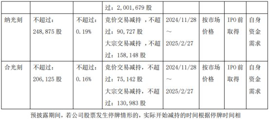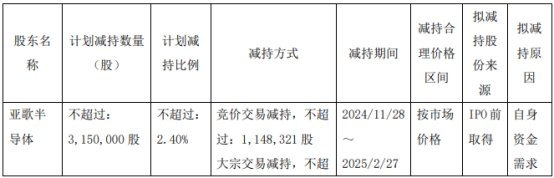 基于自身资金需求,股东亚歌半导体、纳光刻、合光刻拟减持公司股份合计不超过3,605,000股,即不超过公司总股本的2.74%。其中,通过集中竞价方式减持公司股份合计不超过1,314,190股,即不超过公司总股本的1.00%;通过大宗交易方式减持公司股份合计不超过2,290,810股,即不超过公司总股本的1.74%。减持期限为自公告披露之日起15个交易日后的3个月内实施。若减持期间公司发生派发红利、送股、资本公积金转增股本或配股等股本除权除息事项的,减持股份数量进行相应调整,并在相关公告中予以说明。