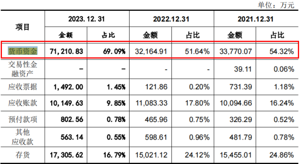 值得注意的是,悍高集团似乎并不缺钱。招股书显示,从2021年至2023年(以下简称报告期),该公司的货币资金占流动资产的比例分并为54.32%、51.64%和69.09%;由此可见, 该公司在报告期内有超过五成的流动资产为货币资金。