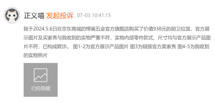 另一消费者买到的悍高厨卫拉篮实物与图片不符,认为商家已构成欺诈。