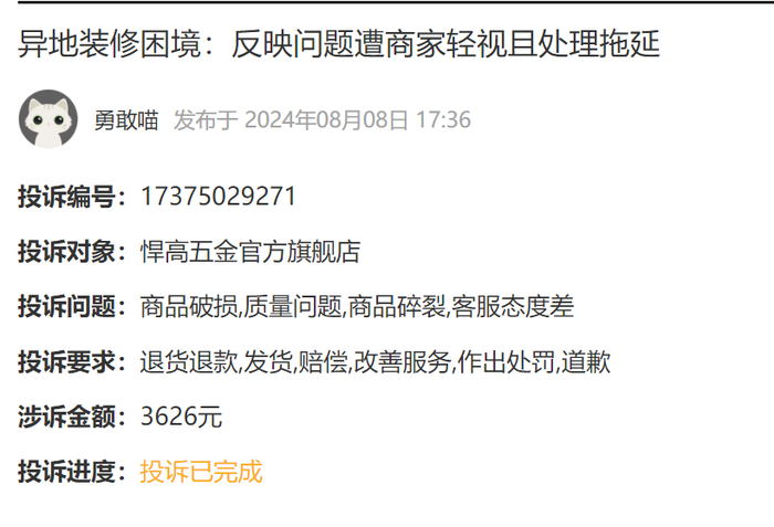 黑猫投诉平台显示,悍高集团多次因质量问题被消费者投诉。一位消费者因怀疑买到了假水槽而投诉悍高集团。