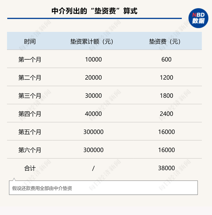 不过记者发现,垫资费其实是按照垫资累计额,每月计算一次。该人士为记者计算了记者需要支付的垫资费,“负债30万元,(养征信)最长六个月,垫资要将负债全部结清,避免影响后续银行贷款。假如养六个月,前四个月还月供1万,第五个月负债全部结清,则垫资费一共是三万八。”