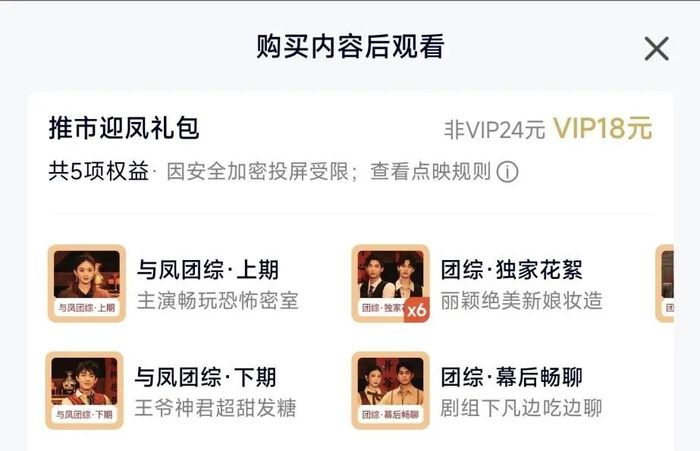 古装仙侠题材的保底,曲折爱情故事的加持,赵丽颖、林更新头部艺人的点睛,使得《与凤行》的站内最高热度达31784,在当时创腾讯视频剧集2024年的最高纪录,并且全网剧集集均播放量及正片播放量均稳居第一。在如此高热度的助力下,其剧综《推市营业中》也更加有底气,30元可解锁大结局超前点映+剧综;非VIP24元、VIP及SVIP18元单独解锁剧综。即便现在超点已经结束,剧综仍然是付费节目,非VIP24元,VIP18元解锁“推市迎凤礼包”,时至今日会员收入仍在增长。