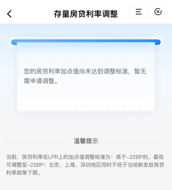 值得注意的是,工商银行针对客户关心的问题进行解答时指出,10月25日银行方面已批量调整了存量房贷利率,大部分房贷利率调整至LPR-30BP,加点值(-30BP)较全国新发放房贷利率加点值(-52BP)高22BP,暂不符合调整条件,当前您无需提出申请。建设银行方面则补充说明,部分固定利率贷款及采用基准利率定价的贷款,如转换为浮动利率贷款后,加点值高于-22BP,可以申请调整;北京、上海、深圳符合条件且成功办理二套转首套的部分贷款,可以申请调整。