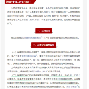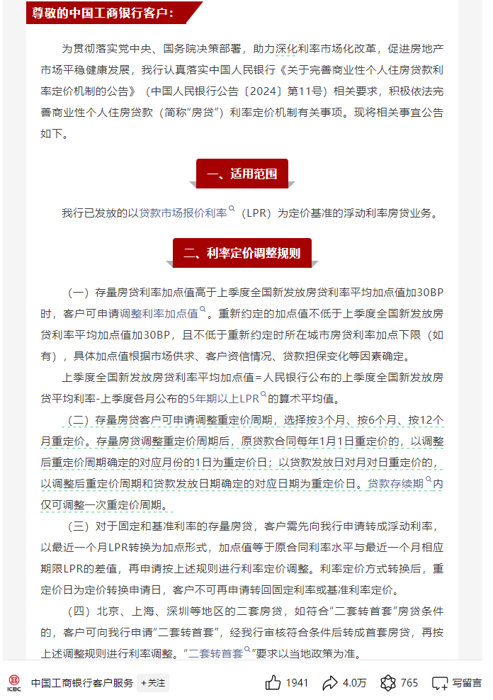 近日,中国银行(601988.SH)、工商银行(601398.SH)、农业银行(601288.SH)、建设银行(601939.SH)等多家商业银行发布公告明确,自11月1日(含)起,将陆续对商业性个人住房贷款利率实行新的定价机制。本轮房贷利率定价机制调整距离各家商业银行批量完成存量房贷利率调整仅过去一周时间。上述两项调整均是对中国人民银行公告〔2024〕第11号文件(以下简称“文件”)相关要求的积极响应。