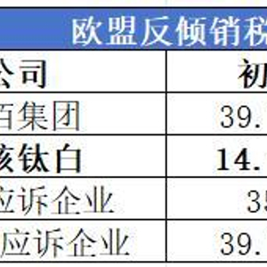 2024年11月1日,欧盟委员会就对华二氧化钛反倾销调查公布了终裁前事实披露文件,按倾销幅度计算反倾销关税税率:龙佰集团32.3%、安徽金星钛白集团(中核钛白旗下公司)11.4%,其他应诉企业28.4%,其他未应诉企业32.3%,同时不会进行追溯征收。值得注意的是,相较于初裁,反倾销税率出现了一定的下降。