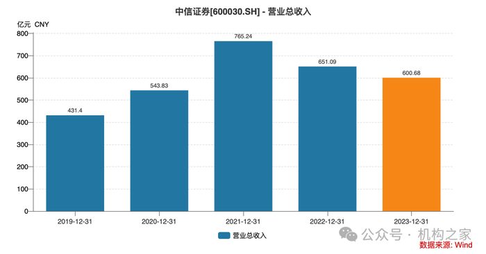 "券业一哥"近年来正经历着的业绩下滑的考验,Wind数据显示,中信证券营收规模自2021年触及765.24亿元的高点后持续下行。2022年降至651.09亿元,降幅达14.92%;2023年收入进一步萎缩至600.68亿元,同比再降7.74%。2024年上半年仅实现营收301.83亿元,同比下滑4.18%。