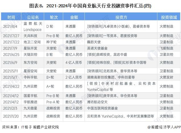 2021-2024年,我国商业航天行业的主要投融资事件如下: