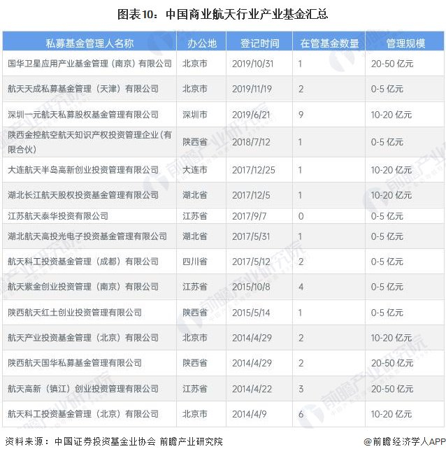 各类投资基金为商业航天的技术创新和市场扩张提供了强有力的资金保障,在推动行业发展中起到了重要作用;其中国华卫星应用产业基金管理(南京)有限公司、陕西航天国华私募基金管理有限公司、航天高新(镇江)创业投资管理有限公司管理规模均在20-50亿元,基金管理规模较大,能够为商业航天企业提供从初创到成熟的全方位资金支持。