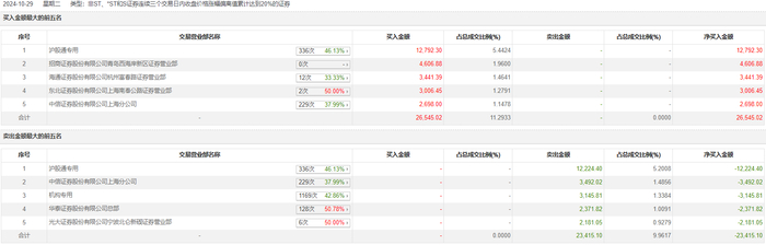 10月29日,旭升集团因连续三个交易日内收盘价格涨幅偏离值累计达到20%而跻身龙虎榜。龙虎榜显示,这三个交易日,沪股通专用账户买入1.28亿元并卖出1.22亿元,位居买入榜及卖出榜第一名;中信证券上海分公司账户则买入2698万元并卖出3492.02万元,另有机构专用账户卖出3145.81万元。