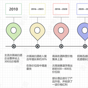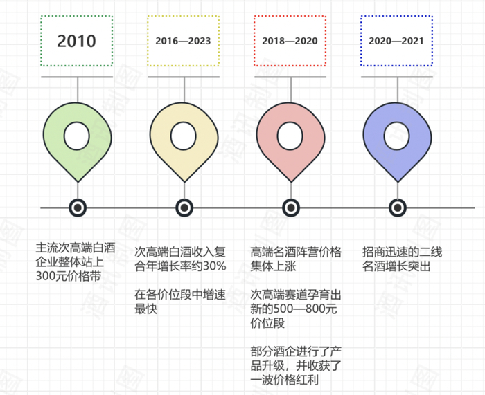 近年来,次高端白酒不断上移,呈现高速增长的态势。资料显示,受益于高端白酒提价红利和地方政府的品牌保护措施,主流次高端白酒企业在2010年后整体站上300元价格带。2016—2023年,次高端白酒收入复合年增长率约30%,在各价位段中增速最快,2018—2020年,高端名酒阵营价格集体上涨,次高端赛道孕育出新的500—800元价位段,部分酒企进行了产品升级,并收获了一波价格红利。随后在2020—2021年,招商迅速的二线名酒增长突出。
