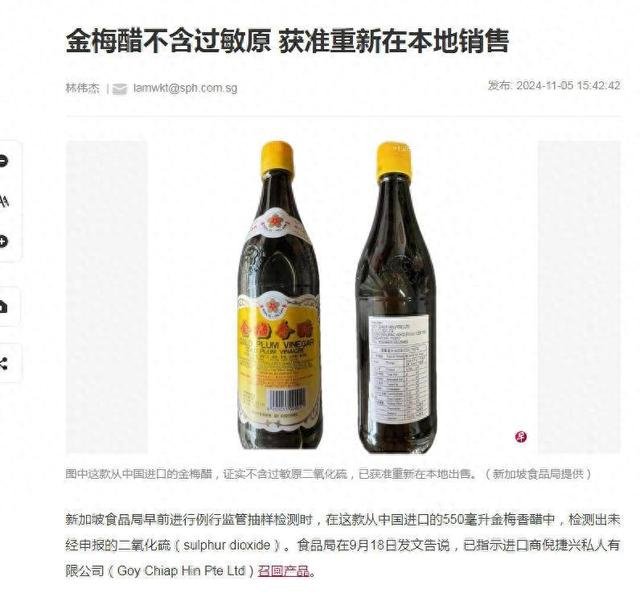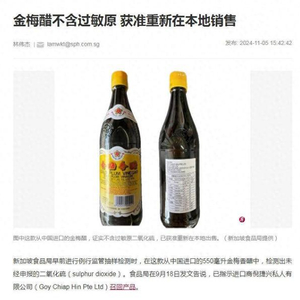 此前,有外媒报道称,新加坡食品局早前进行例行监管抽样检测时,在这款从中国进口的550毫升金梅香醋中,检测出未经申报的二氧化硫(sulphur dioxide)。食品局在9月18日发文告说,已指示进口商倪捷兴私人有限公司(Goy Chiap Hin Pte Ltd)召回产品。