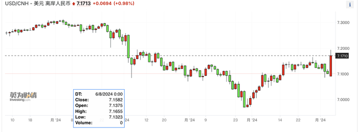 刘杨对记者称,在强美元下,短线人民币可能会测试7.2,其实日元、韩元当日跌幅更大。“但市场仍认为刺激政策或为经济托底,而且短期不排除央行会采取逆周期措施稳定汇率,需要关注美元/离岸人民币本周晚些时候会否重新回到7.15以下。”