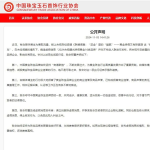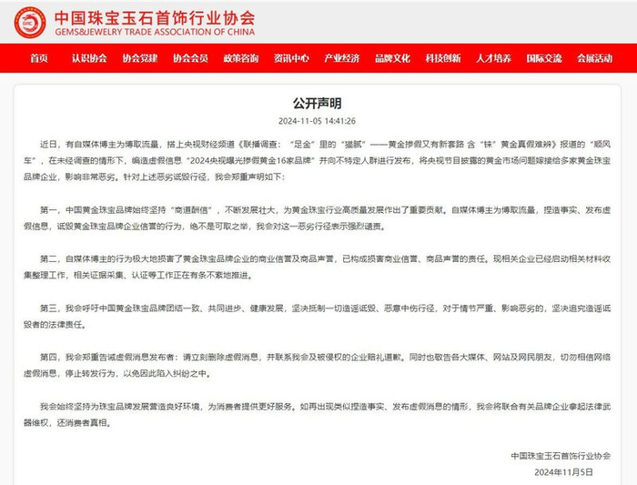 近日,有自媒体博主发布内容称“央视曝光16家品牌黄金掺假”,并受到各大社交平台发布及转发,影响范围巨大。针对上述网传消息,中国珠宝玉石首饰行业协会于2024年11月5日正式发布官方公开声明辟谣,此条网传消息为虚假编造,有自媒体博主为博取流量,搭上央视财经频道《联播调查:“足金”里的“猫腻”——黄金掺假又有新套路 含“铼”黄金真假难辨》报道的“顺风车”,在未经调查的情形下,编造虚假信息“2024央视曝光掺假黄金16家品牌”并向不特定人群进行发布,将央视节目披露的黄金市场问题嫁接给中国黄金、周大生、周大福、周六福等多家黄金珠宝品牌企业,影响非常恶劣。