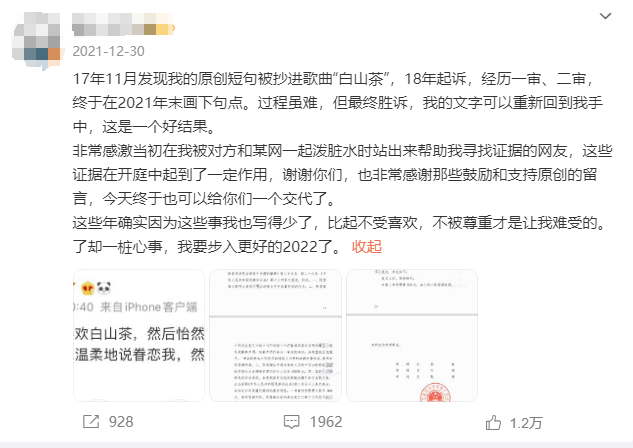 这并非是陈雪凝第一次被卷入抄袭风波,2017年11月,一名微博博主发现自己在2013年写的原创短句被抄袭进陈雪凝的歌曲《白山茶》中,2018年该博主起诉,经过一审二审,最终在2021年年底胜诉,法院判定该文案属于博主的原创,陈雪凝败诉并赔偿博主3万余元。