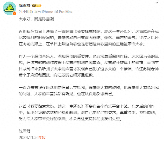 当着原作者的面唱抄袭他的歌遭批评,陈雪凝发文回应争议
