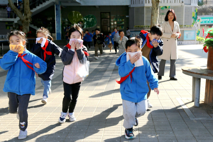 5日上午9:50,二七区建新街小学行知校园响起紧急的警报声,同时校园广播里传来“教学楼发生火灾,请全体师生快速、有序、安全撤离到大操场!”的指令。班主任和辅导老师分别迅速到位,组织各班学生用湿毛巾捂好口鼻、躬下腰身、快速从教室前后门有序撤离。在护导人员和志愿者的陪伴指挥下,各班学生安全快速到达操场集合,并清点上报人数。