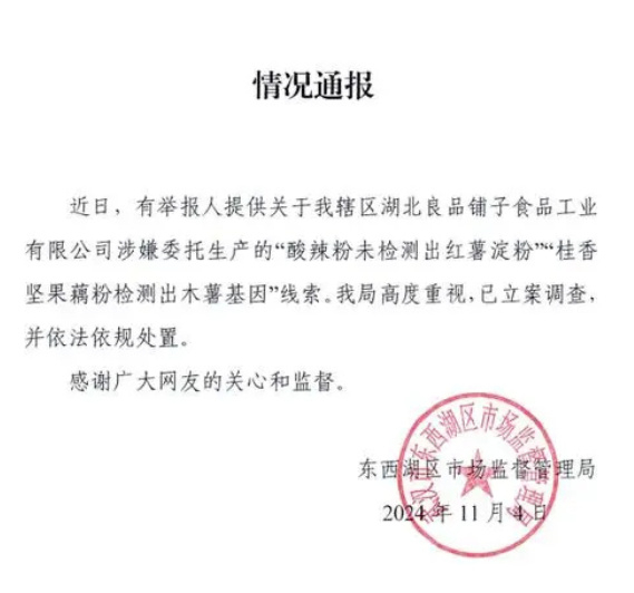 藕粉里掺杂木薯淀粉?良品铺子被立案调查