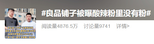 11月3日,视频博主“松哥打虎”“赏金猎人灰烬” 一起发布了一条视频,质疑良品铺子多款产品配料表不实,涉嫌造假。其在发布的视频中表示:“良品铺子一款藕粉中检测出木薯粉成分,而一款酸辣粉的配料表中只写了红薯粉,但却未检出红薯粉,也未检出木薯粉和马铃薯粉。”