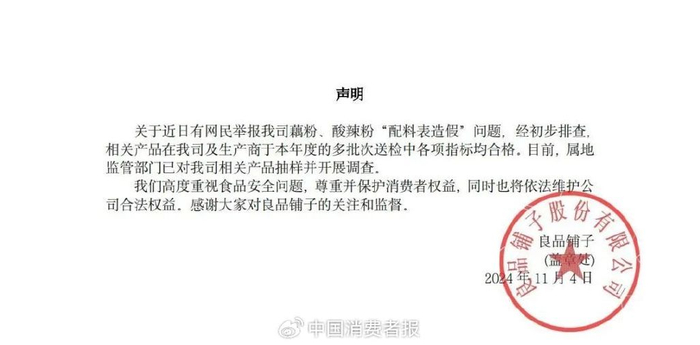 良品铺子发表了一份官方声明