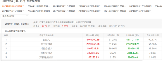9月至今,川发龙蟒最高涨幅接近三倍,川发龙蟒股价高涨之际,是谁选择了跟风,甚至接盘?从龙虎榜来看,散户和中小投资者成为绝对主力。11月5日,川发龙蟒创出10月下旬以来股价的第七个涨停。连日来,自然人买入额超过446亿元,大幅超越机构投资者和深股通投资者。