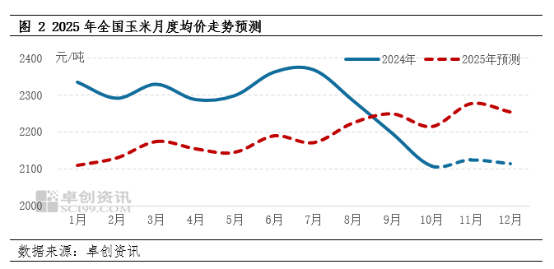 2025年预计玉米市场供需相对紧张,因主产区出现不同程度减产,玉米供应量下降,然需求增幅有限,理论供需差或下降。卓创资讯预计2025年一季度震荡上涨,因购销活跃度提升,企业补货及贸易商建库对价格有支撑。二季度先跌后涨,一季度涨至高位后,二季度初高位回落,随后季度末售粮收尾,且小麦上市利多玉米,玉米购销量下降或仍有上涨空间。三季度整体上涨,主因考虑到本年度玉米供需差下降,三季度或有青黄不接现象支撑玉米价格。四季度新季玉米低开高走,然后下跌,影响因素和本年度四季度或趋同。