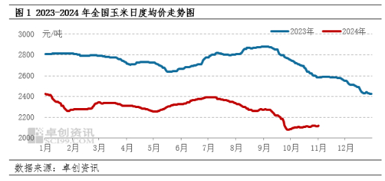需求方面,据卓创资讯数据统计,2023/24年度下游深加工及饲料行业玉米总消费量达到2.58亿吨,年度供需差是3590万吨,理论供需差同比上年度增加1693万吨,供需差扩大,体现出玉米供需格局相对宽松,导致2024年玉米价格同比2023年略低。截止到2024年10月31日,2024年(1-10月)玉米年均价是2288.05元/吨,较2023年全年均价跌435.05元/吨,跌幅15.97%。