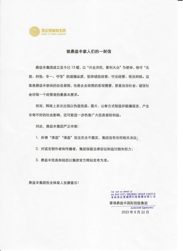 2023年2月,深圳金融监管部门发布关于香港上市公司中国鼎益丰的风险提示,称经初步核查,“鼎益丰”关联的主体众多,且分布在全国各地,在深圳的经营主体不持有金融许可证、不具备从事金融业务资质。