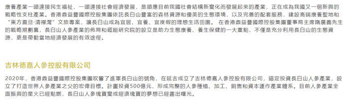 2)官网介绍,康养产业,在香港鼎益丰国际控股集团董事局主席隋广义先生的战略规划里,长白山人参产业的布局和磁能研究院的设立是助力生态康养、养生保健的一大重点,不仅是充分利用长白山的生态资源,更是带动当地经济发展的有效途径。