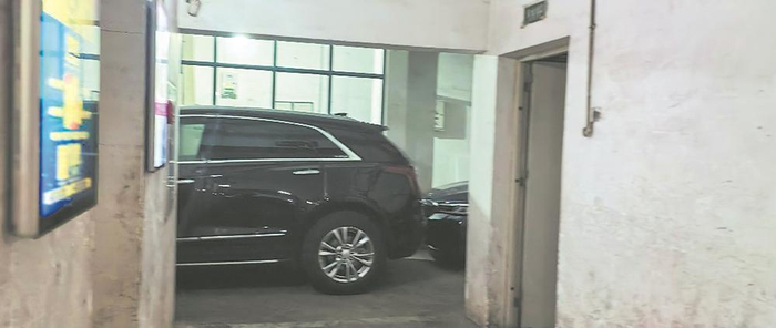 记者下到负一楼停车场,停车场不大,但好几处都有隔离栏,将地下车库分成了一块一块,有的地方还堆放了杂物,入口左侧的过道上还停放了车辆,倘若消防车在里面行驶,将极不畅通。