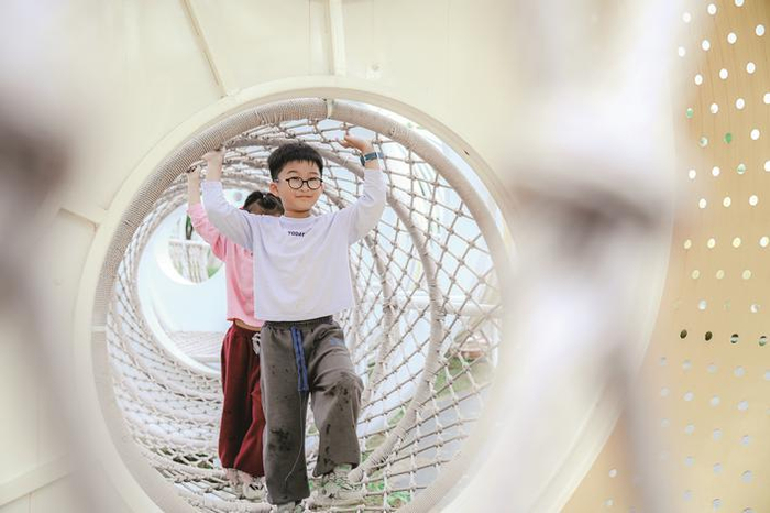 目前,整个园区占地约340亩,其中水域面积占到了100亩,虽然总体上划分为“丛林部落”“农牧部落”“星空部落”“水乡部落”四大板块,但各个主题部落依托高低错落的地形和生态景观融为一体,为孩子们的探索活动提供“自然的怀抱”。