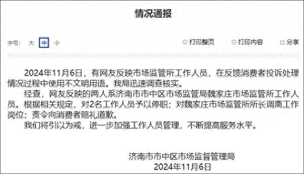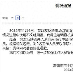 据济南市市中区人民政府网站消息,11月6日,济南市市中区市场监督管理局发布情况通报称,当天,有网友反映市场监管所工作人员,在反馈消费者投诉处理情况过程中使用不文明用语。我局迅速调查核实。