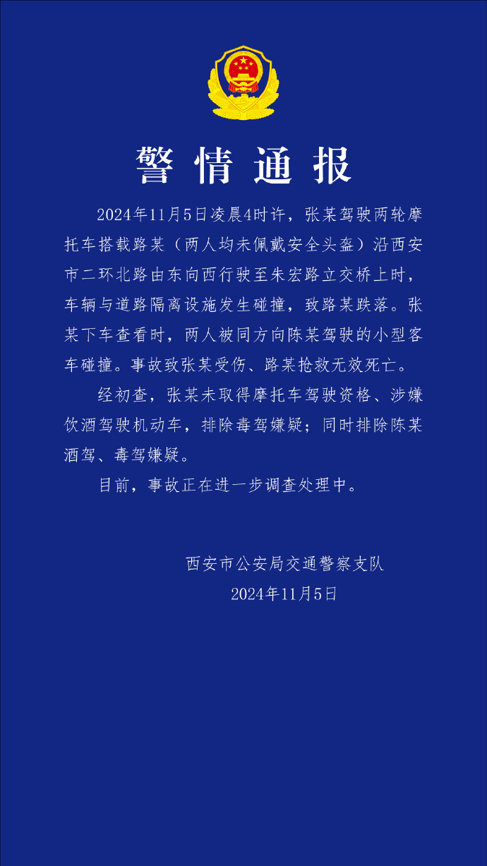 ·西安交警通报男子酒驾摩托摔倒后被后车二次碰撞:致一死一伤。