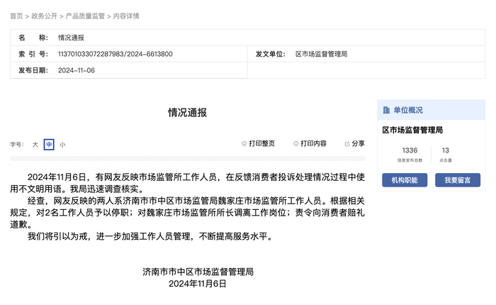 ·济南一市场监管所2名工作人员处理投诉时使用不文明用语,官方通报:停职。