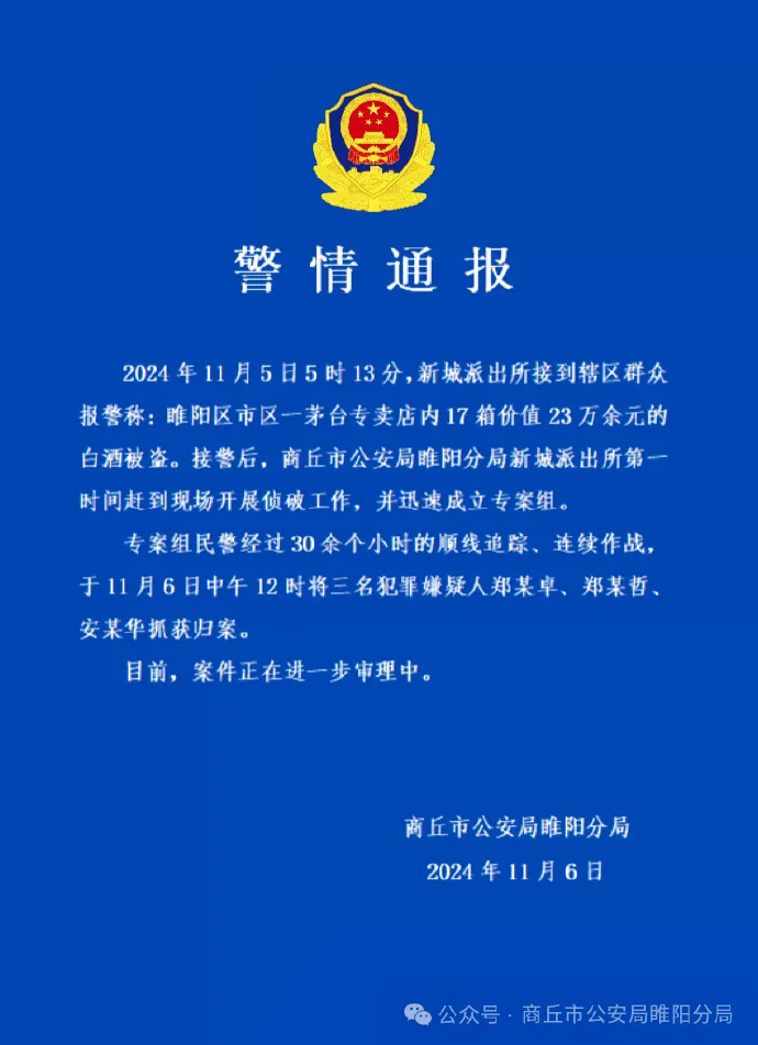 ·河南商丘警方通报“一店铺17箱价值23万茅台被盗”:3名犯罪嫌疑人被抓获。