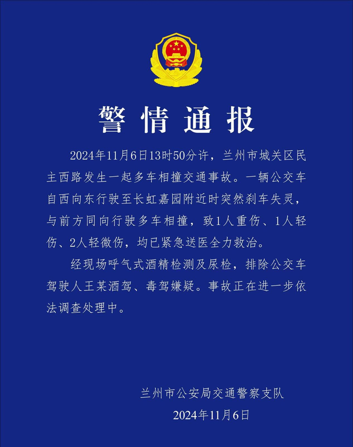 ·兰州一公交车刹车失灵致多车相撞,目前已致4人受伤。
