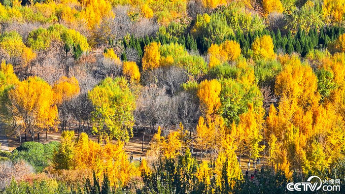 济南森林公园内成片的银杏树叠翠流金,金黄的叶子在阳光下摇曳,风儿一吹,片片黄叶悠悠然飘向大地,如彩蝶翩翩起舞,把深秋的美渲染到极致。