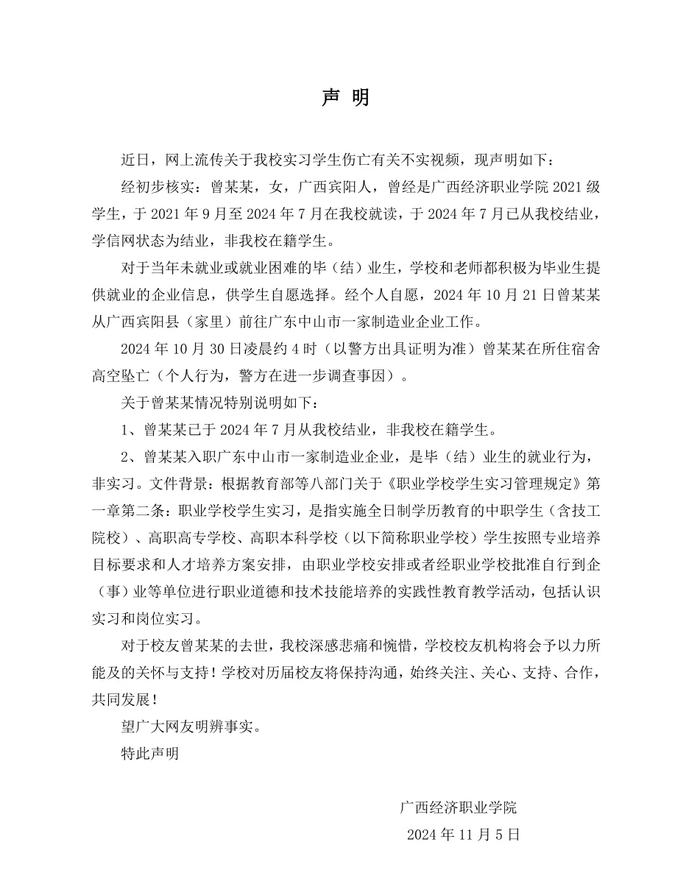 ·网传广西一职业学院女孩实习期间坠亡,校方发布声明。