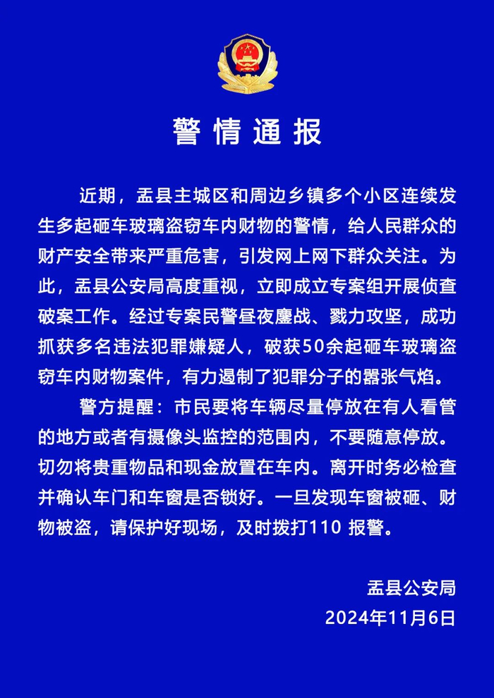 ·山西盂县破获50余起砸车玻璃盗窃车内财物案件,多人被抓获。