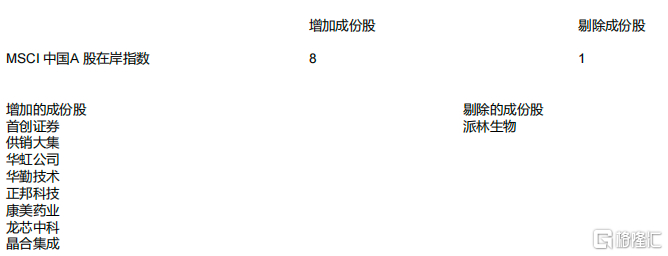 MSCI中国A股在岸指数中,新纳入8只成分股,包括首创证券、供销大集、华虹公司、华勤技术、正邦科技、康美药业、龙芯中科、晶合集成;剔除了派林生物。