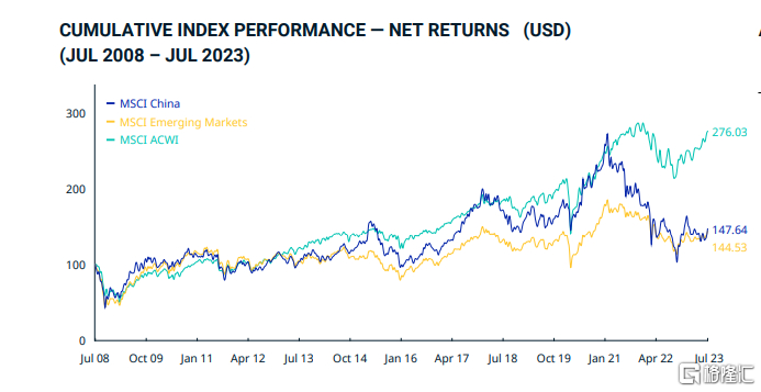 自2008年12月美国次贷危机后,MSCI中国指数整体呈现上涨态势,并在2020年时录得超过300%的最高涨幅。2020年后中国股票指数有所回落,截至2023年底,15年累计涨幅97.72%,同期新兴市场指数和明晟全球指数涨幅分别为173%和364%。