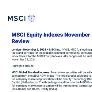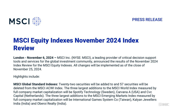 北京时间11月7日,国际指数编制公司MSCI公布了11月股票指数审查结果。其中,MSCI中国指数新纳入了4只中国股票,剔除20只个股,所有变更将在2024年11月25日收盘后生效。