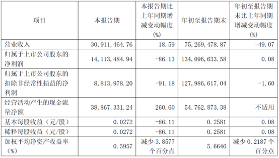 上周,春兰股份发布2024年三季度业绩公告,前三季度,公司营业收入约7527万元,同比减少49.07%;归属于上市公司股东的净利润约1.34亿元,同比增加0.08%;基本每股收益0.2581元,同比增加0.08%。三季度单季,公司营业收入3091万元,同比增加18.59%;归属于上市公司股东的净利润约1411.3万元,同比减少86.13%。