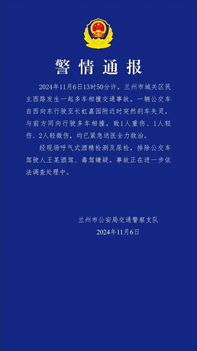 经现场呼气式酒精检测及尿检,排除公交车驾驶人王某酒驾、毒驾嫌疑。事故正在进一步依法调查处理中。